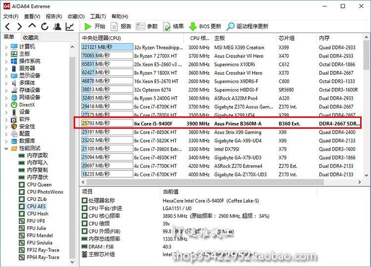酷睿I5 9400F Aida64 CPU AES测试排行榜