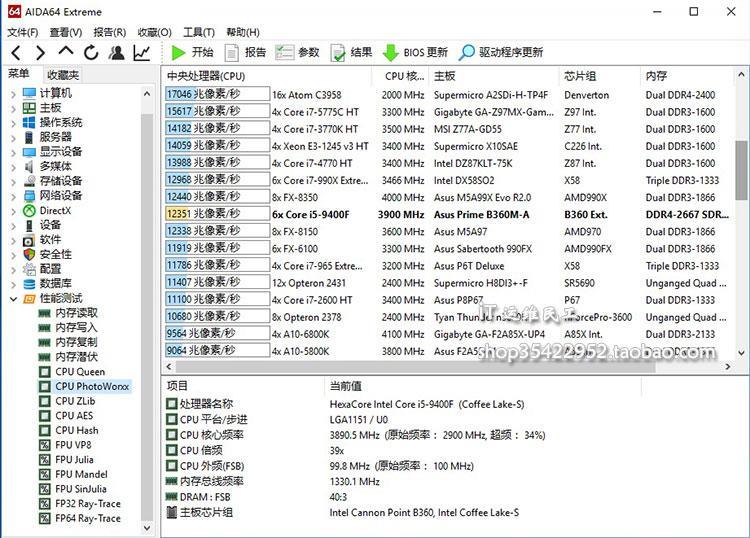 酷睿I5 9400F Aida64 CPU PhotoWorxx测试排行榜