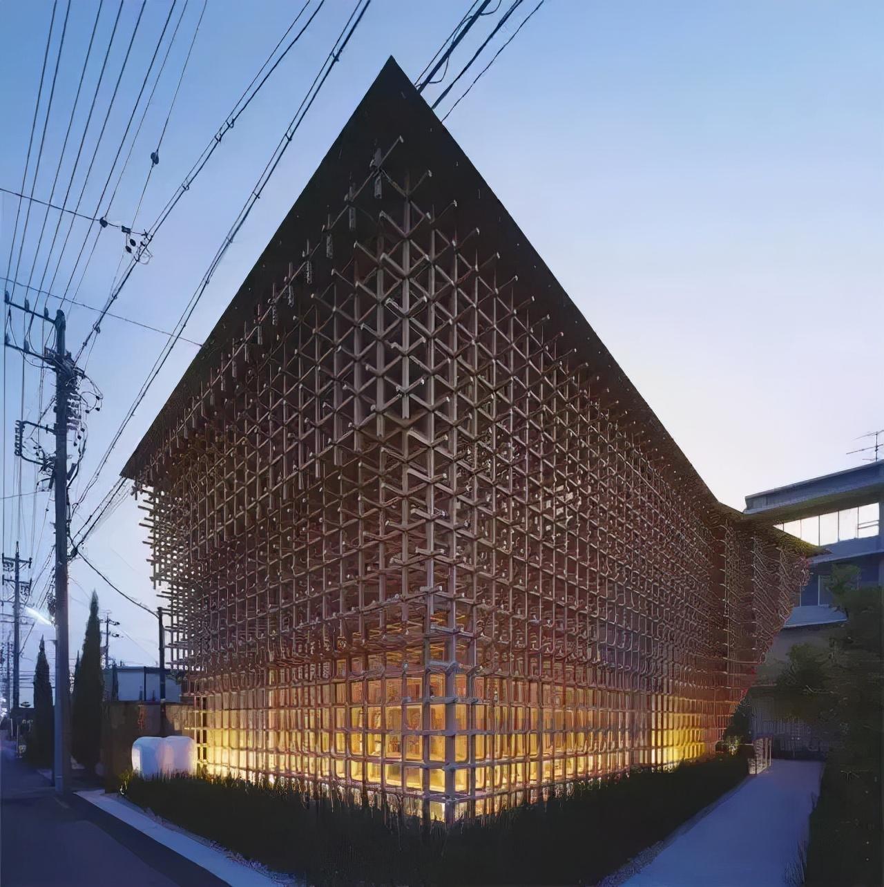 这座博物馆的构造灵感来自于类似"鲁班锁"的木工玩具。隈研吾在2007年的米兰设计展上就曾展出过一个小型的装置构造物作为研究模型,如今将其用在建筑设计中。