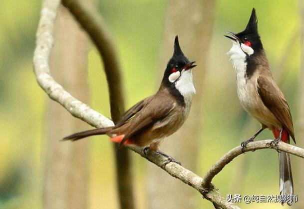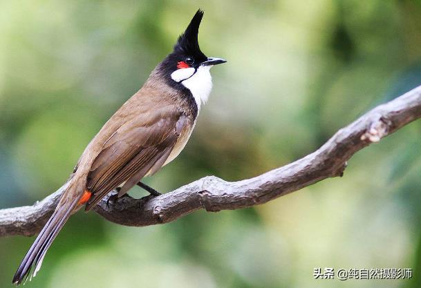 红耳鹎(学名:Pycnonotus jocosus),是鹎科、鹎属的鸟类。红耳鹎为小型鸟类,体长17-21cm。红耳鹎前额至头顶黑色,头顶具高耸的黑色羽冠,眼后下方有一深红色羽簇,形成一红斑;耳羽和颊白色,紧连于红斑下方。后颈、背至尾上覆羽等其余上体棕褐色或土褐色,有的标本具棕红色羽缘。尾暗褐或黑褐色,除中央1-2对尾羽外,其余尾羽内翈具白色端斑,并愈向外侧尾羽此白斑越向外翈扩大,直至整个端部。两翅覆羽与背同色,飞羽暗褐色或黑褐色,外翈略缀土黄色或淡土褐色。颊、喉白色,且和颊部白色之间有一黑色细线,从嘴基沿颊部白斑一直延伸到耳羽后侧。其余下体白色或近白色,两胁沾浅褐色或淡烟棕色,胸两侧各有一较宽的暗褐色或黑色横带,自下颈开始经胸侧向胸中部延伸,且形渐细狭,最后中断于胸部中央,形成不完整的胸带,尾下覆羽鲜红色或橙红色。红耳鹎的虹膜棕色、褐色、棕红色或深棕色,嘴、脚黑色。