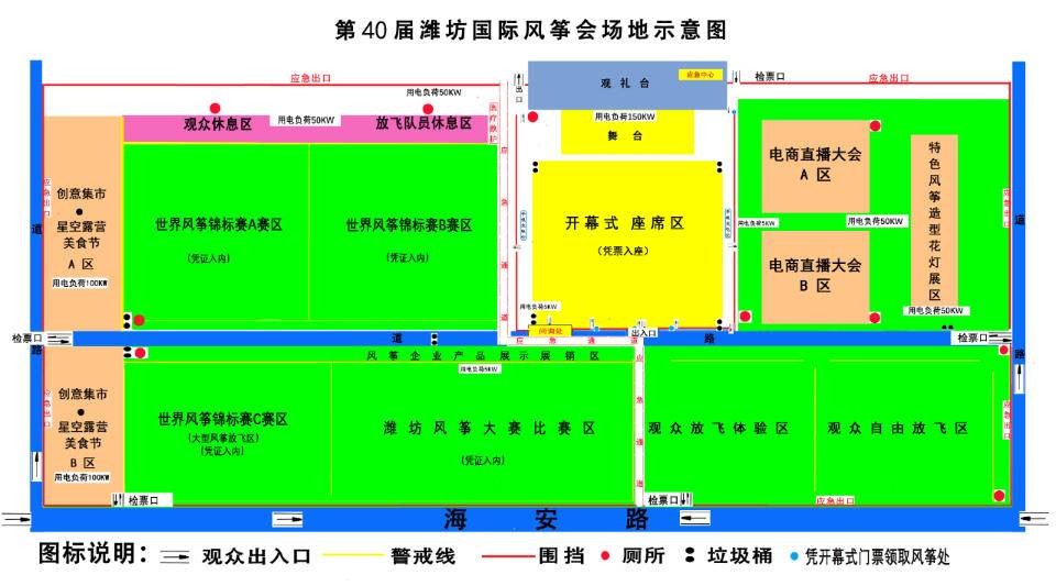 二、4月15日上午10:00本届风筝会开幕式在潍坊滨海国际风筝放飞场(渤海路与海安路交叉口西北方)举行,请与会嘉宾和观众凭开幕式票提前30分钟入座。