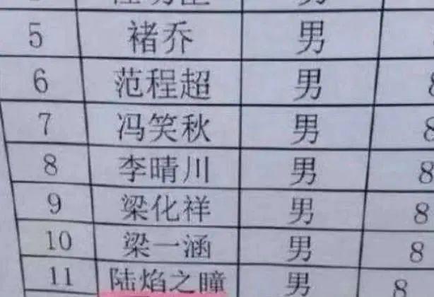 而这个名字在接下来要说的“四字”姓名中却显得有些“小巫见大巫”。还有一位学生的名字为“陆焰之瞳”,这未免对于学生而言有些“晦涩难懂”,这难道不是为难还处于启蒙阶段的学生?