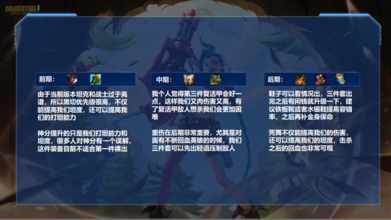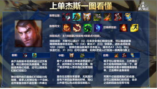 多种不同出装,最后结合出来一套完美出装。首先我们来看一下当前版本杰斯的优势点都在哪里:爆发高、攻击距离远、拉扯能力强、支援速度快、分推能力优秀。所以现在版本的杰斯不管是对线、打团还是单带都非常强,这也是我一直推荐他的原因。