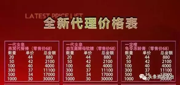 据代理商小白(化名)介绍,目前,一代女皇瘦身产品主打三款:益生菌酵母糖果、一定嗖龟苓膏,还有燕麦代餐棒,“30盒1320元即可成为代理,卖完赚720元;还有20盒880元的门槛,卖完赚480元。”