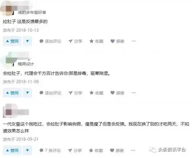 自媒体“NICE健康”,则在一代女皇的试吃体验中,如此写道:“我们买了一罐一代女皇回来,四个同事各吃一粒,全都拉肚子了。其中三个人是当天深夜就拉了肚子,而且非常痛。照理说,产品配料表中没有会让人疯狂拉肚子的原料,但是吃了一粒就全员拉肚子,让人不得不怀疑配料表的真实性。”