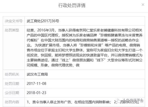 如此宣传,给缇丽莎尔招来了行政处罚。根据国家企业信用信息公示系统显示,缇丽莎尔将“珍嗖啦和米昔”等产品的电商、微商销售市场定位于家庭主妇和大学生群体,宣称可为家庭妇女和大学生打造一个低投资、快回报,能将梦想照进现实的快速致富平台,并以微信营销模式为主要销售途径,通过“线上”微信朋友圈和“线下”大型会议等形式对其公司规模、形象,微商代理优势、微商致富案例以及在产品功能、功效等方面进行了不同程度的虚假宣传,诱导部分家庭主妇和大学生群体参与到其微商销售代理中来。