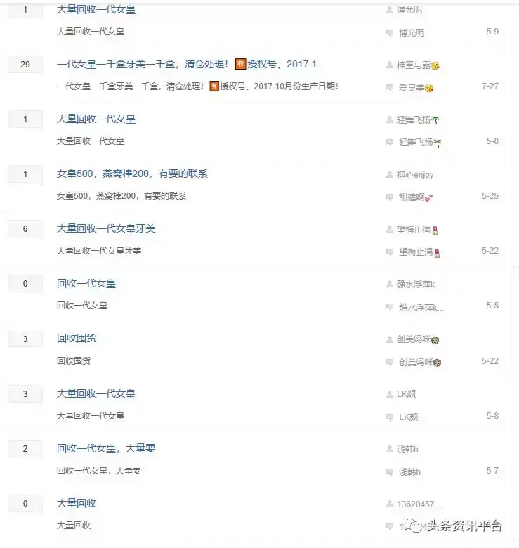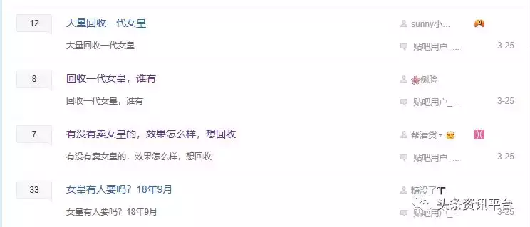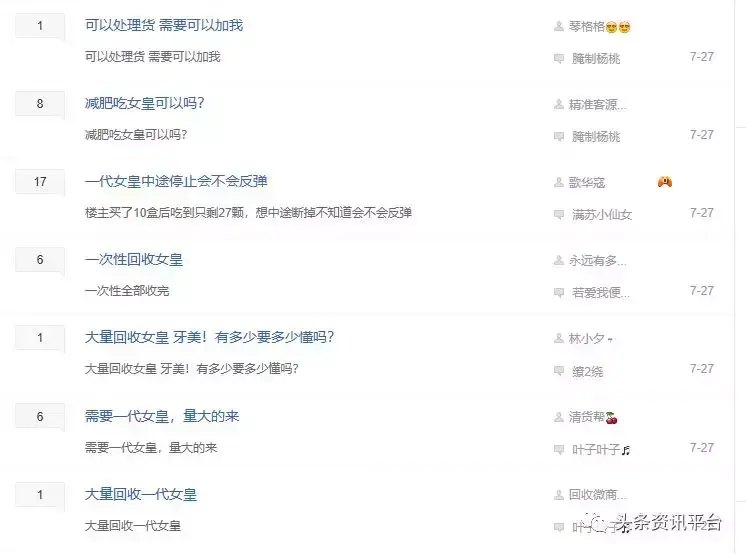 在一代女皇的代理商当中,就有不少人在为“清货”而苦恼,一名网友在“一代女皇”的百度贴吧发帖:“一代女皇软糖便宜清货40一桶”,下面就有评论呼应:“40元两桶”、“100五桶”等。而在目前来看,一代女皇这几款产品的囤货现象都较为严重,在贴吧及相关论坛上,“回收”、“清货”等字样随处可见。