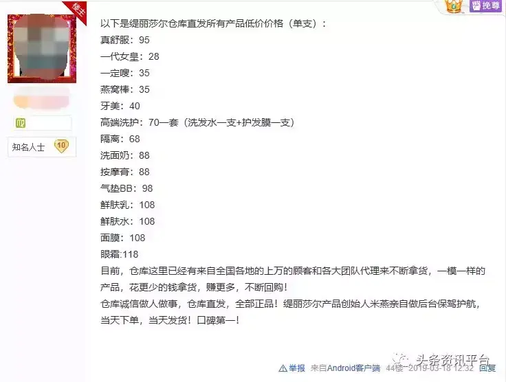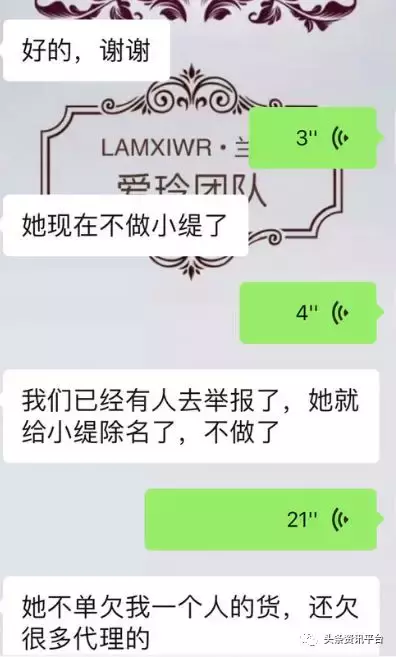 除了囤货、清货这些行业普遍存在的问题外,部分一代女皇上级代理商的作为,则更加令人齿冷,有代理商爆料称,自己的上家不做缇丽莎尔改做“轻奢世家面膜”后,要他们也跟着做这个品牌,而当这个代理上家因举报被除名后,她拖欠代理们的货,也随之变成了胎死腹中的冤魂。