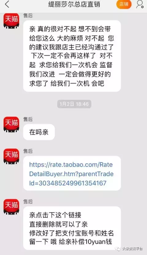 其后,晓丽因“拉肚子,让想买的人再想想”而发了差评,结果遭到了店家的疯狂轰炸,他们通过淘宝、电话、短信大打苦情牌,还向其允诺删除差评后可返还10元,而当差评真正删除后,售后却就此不见踪影了,最后,晓丽只能无奈地自嘲,“更别说那十块钱了,合着是骗我删除差评啊。”