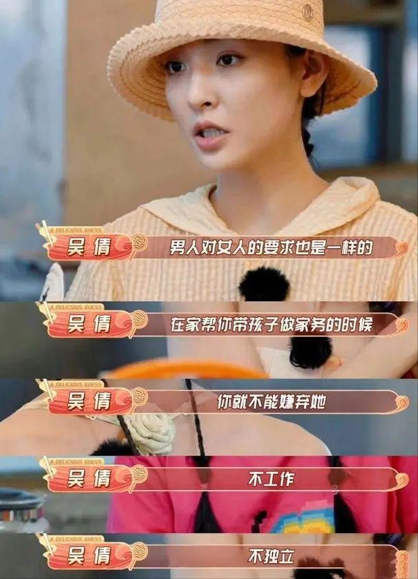 在节目中,她发表了自己对男女婚后分工问题的看法。吴倩认为女子在家带孩子、做家务时,对方就不能嫌弃她不工作,不独立。