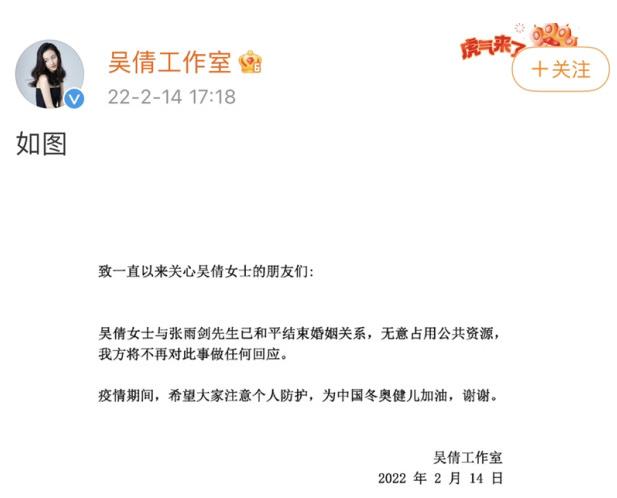 众人疑惑没过多久,吴倩和张雨剑就分别发布了离婚声明,从此分道扬镳了。