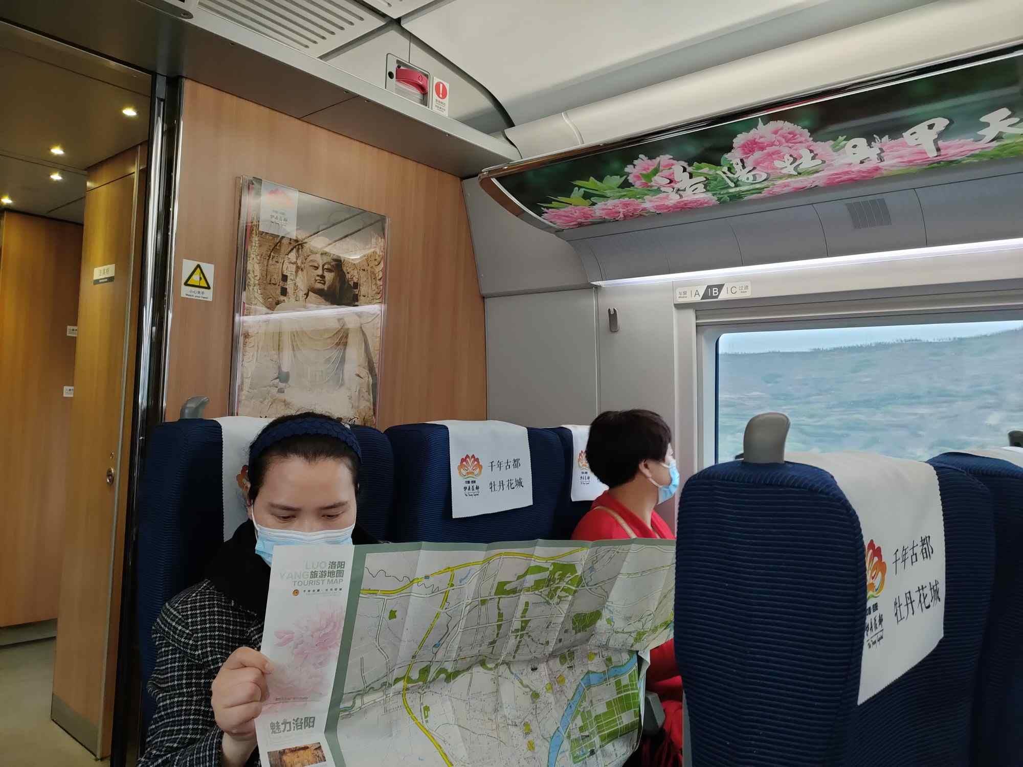 据列车长薛孟浩和于楠楠介绍,本次列车是定制款列车,列车上洛阳元素丰富,例如,每个座椅背后都有隋唐洛阳城国家历史文化公园的宣传图,座椅背袋内都有一份洛阳旅游地图、洛阳旅游指南、洛阳旅游攻略、洛阳旅游地图。列车的座椅靠背巾、行李架、小桌板、车门内、显示屏等,处处彰显洛阳文化气息。行李架上的满屏牡丹花图案、卢舍那大佛像等,让旅客们感受到千年花城洛阳的魅力。