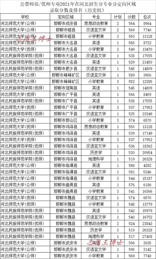 公费师范招生院校2021年在河北招生录取分数及位次4(历史组定向邯郸)