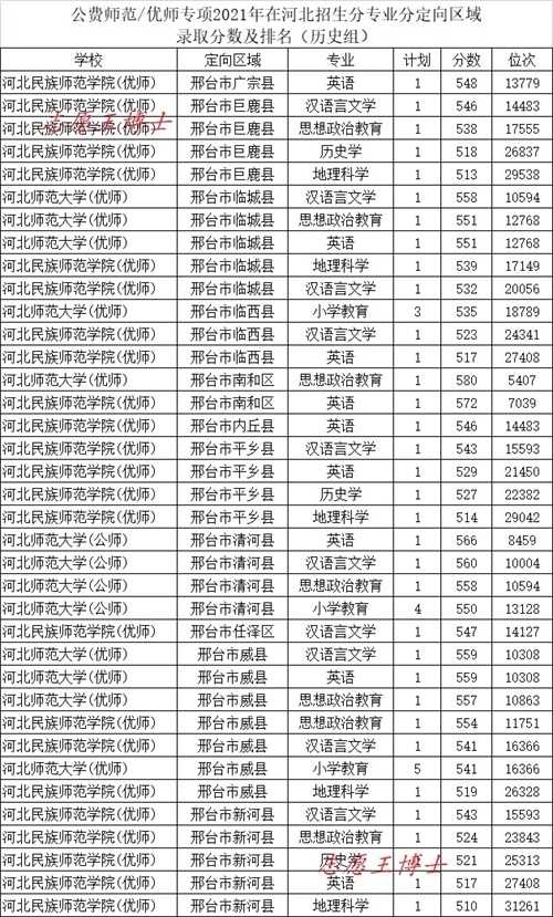 公费师范招生院校2021年在河北招生录取分数及位次9(历史组定向邢台)