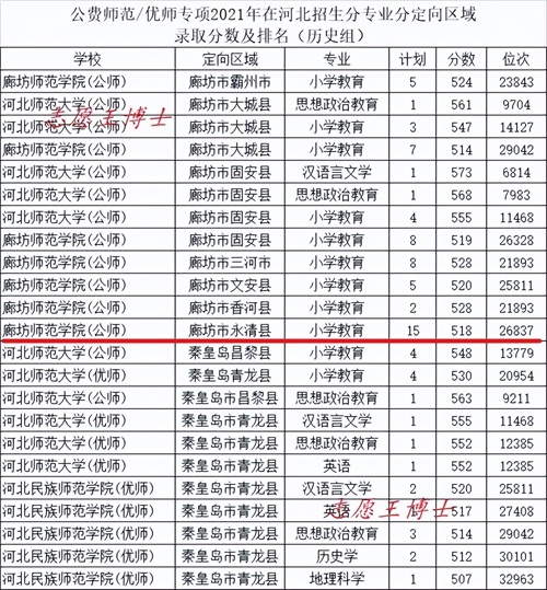 公费师范招生院校2021年在河北招生录取分数及位次6(历史组定向廊坊秦皇岛)