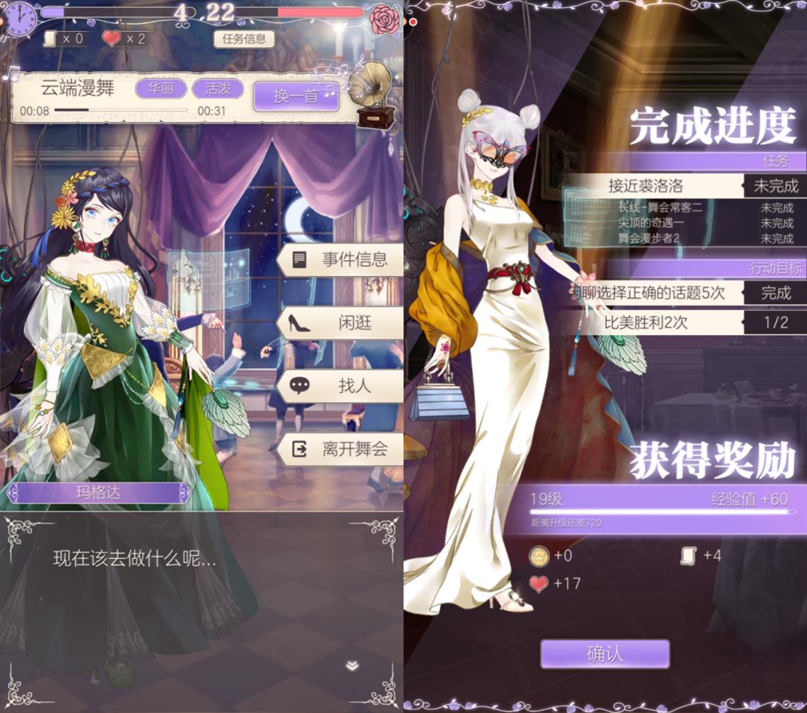 在舞会的途中,玩家除了探取情报以外,还可以通过和各方人物交谈、比美、跳舞等来增加好感度。此举也能让玩家更进一步的了解本作的剧情。