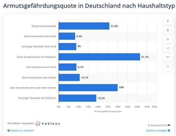对于拥有2个未满14岁的孩子的四口之家来说,如果夫妻俩人每月的共同收入低于2174欧元,也可被归入贫困群体(对于单亲且育有两子女的家庭来说,贫困标准降至每月1656欧元)。
