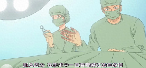 二是红色的血渍染到绿色的手术服上,看上去是黑色的,不会给人一种血淋淋的感觉;