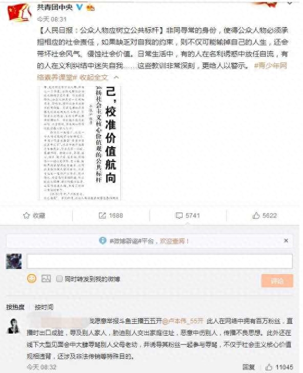 在12月7日一早,共青团中央首次发声:“公众人物应树立标杆,承担相应的社会责任,不应该因为名利诱惑放任自流,迷失自我!”这一次的发生也让很多网友表示是对“五五开粉丝见面会”事件的再次“警告和暗示”!